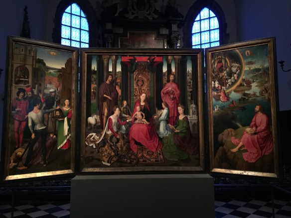 After an unusual Aztec chocolate drink with lunch, we visited the Lamp Museum, before finishing our day’s travels at St John’s Hospital. Below our drinks is a picture Memling’s famous altar-piece, painted for the hospital chapel.