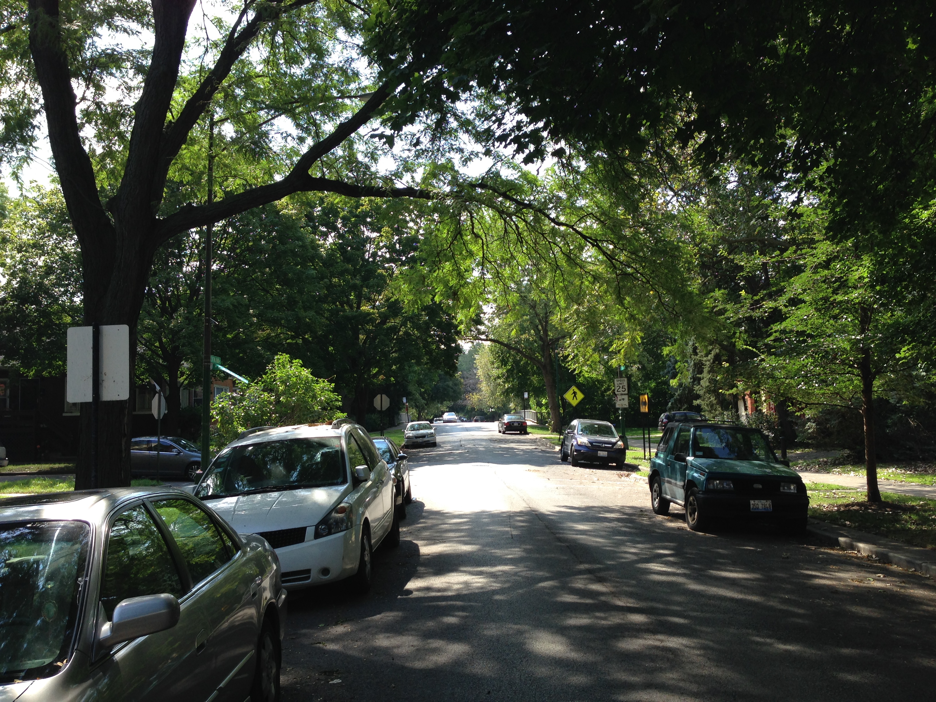 That “spread out” feeling is even greater out of the centre of Chicago; here are a couple of pictures showing what it is like in a suburb, both quiet side street and a main street.